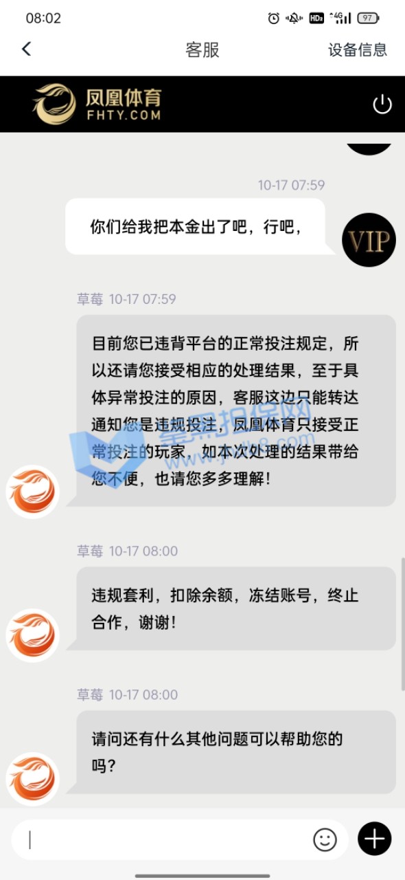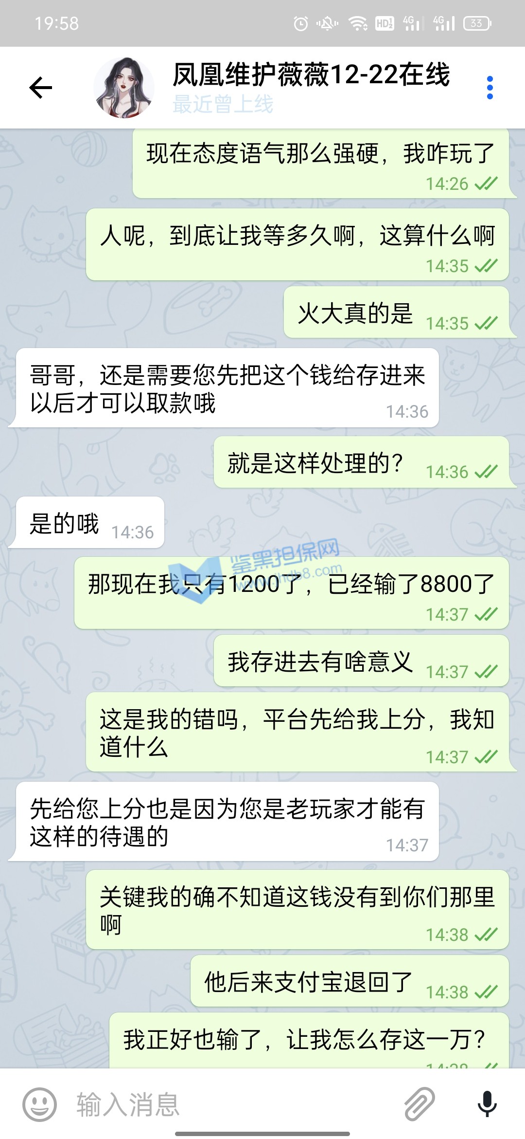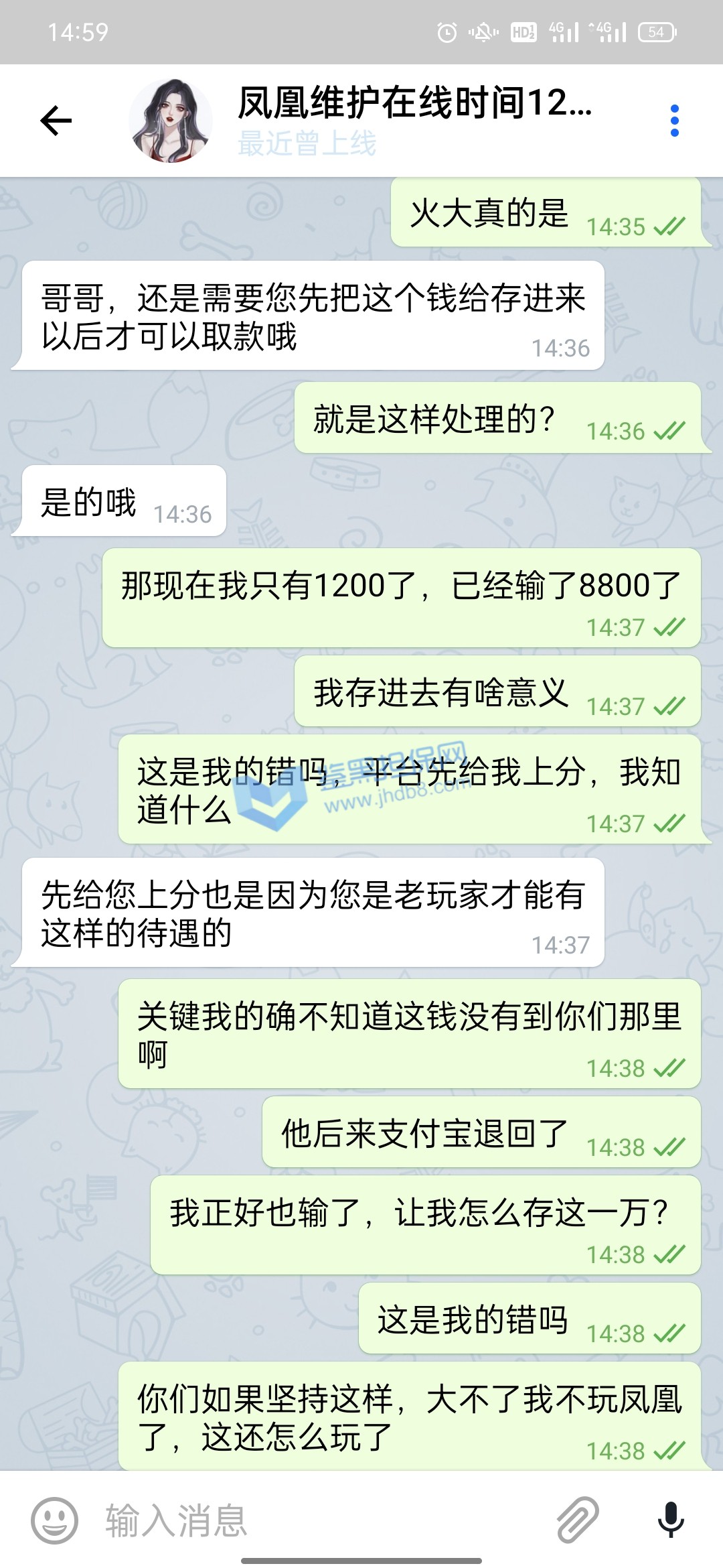 我10月11号支付宝转银行卡存款10000在平台,到账了后我立刻就玩了,途中我支付宝给我发信息这笔款退回了,也就是说没成功到他们那边,那他们给我这10000分怎么弄得,还显示存款成功,我心里面美滋滋的,就没管也没去找诉说,毕竟得了便宜了,等打完流水当时盈利了差不多3645提款显示如图1被限制出款,我就去问客服,客服给我的回答是财务没收到款,优先给我上的分,等财务收到了会处理提款通道!我心里一想这事也没普啊,就没想着提了,也没想过补回了,就去转pg电子玩,结果出乎意料出了很多免费,我就出了免费就退出,出了免费就退出,差不多有三五个这样的免费,一百一转的,当时台面就剩1205,我想的是这么多免费随便一爆也好几万了,存一万补回他们给我优先上的一万就好了。当时也有疑虑还去咨询了我的线下彩金福利,他也说存回去补上就能正常存取了,由于不确定免费到底能爆多少,万一爆不到一万,我存了有啥意义,我就再存前去免费里放了分,一看有12000了,赶紧偷了我妈手机存款完后删除转账记录补上提款赶紧还回来吧,存上后客服刚开始说扣除盈利只留一万本金,我当时就蒙了,想想还有那么多免费,留一万就一万吧,结果没一会直接给我留了1205,我问为什么也是莫名其妙一大推我看不懂的借口,当时心里还是想着只要能正常取款反正有免费在那藏着,只要能给我出,我就不亏,也没多理论,就把台面的1205赶紧试着提款一千,结果没一会到账了,我心里还有点开心,也紧张,就想着应该稳了,就去免费里转,转了一下就爆了一千,我就赶紧又把1210一下子全提了,当时在紧张焦急的等待十来分钟后也到账了,当时台面没有分了,我心想一分没有拿什么赢,就又存进去两百随便打了几下再去放分,这次放了9300提款8000,留了1300在余额,结果就遇到一小时不到账,我就问客服,客服让我提供手持身份证银行卡并写日期的白纸拍照给他们说什么身份验证,我想想也有道理,当时提款心比较急切,就按他们的提交了,提交后来了句要审核七天,我一听就慌了,当时还是相信他们的,毕竟凤凰平台我玩了308天了在这总体肯定是输,直到今天我想登进去看审核进度,才发现设备存在风险,无法使用本平台。下面图都在下面,请鉴黑网帮我维权,被我妈发现我就完了,我给你们跪谢了!!
