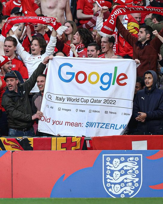 在球场边,几名瑞士球迷打出了一则横幅。横幅上印着谷歌搜索页面,在用谷歌搜索“意大利、卡塔尔世界杯、2022”这几个关键词时,推送的结果是“你指的是瑞士吗”。通过这种方式,瑞士球迷疯狂嘲讽意大利的出局。